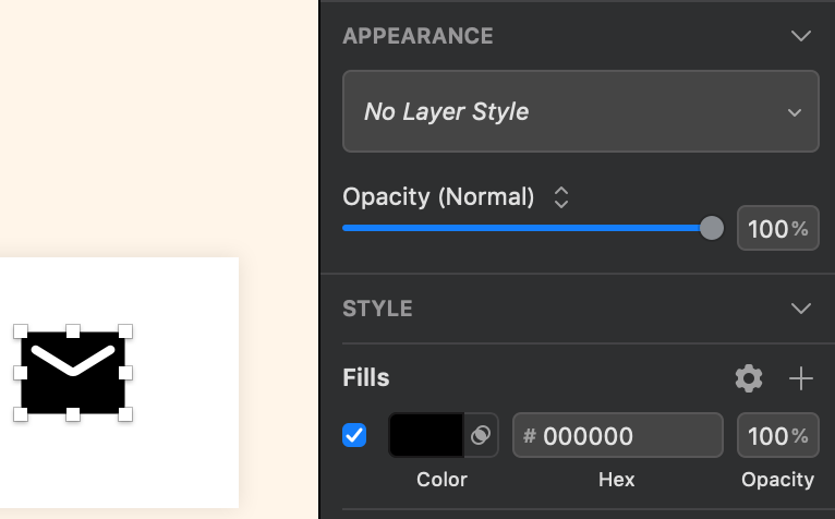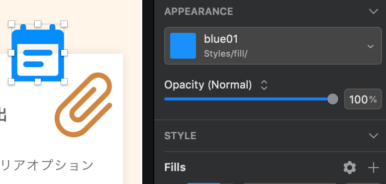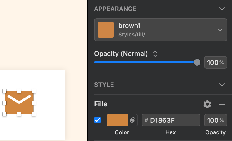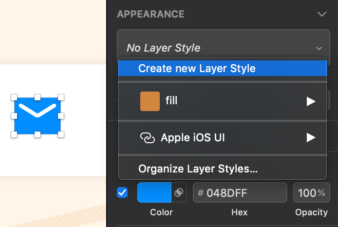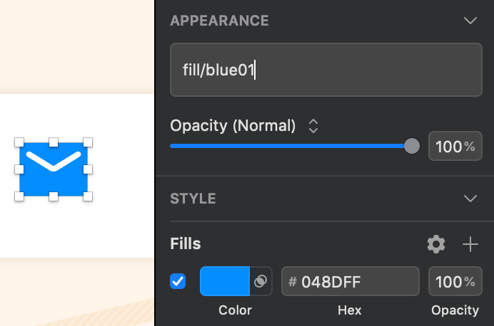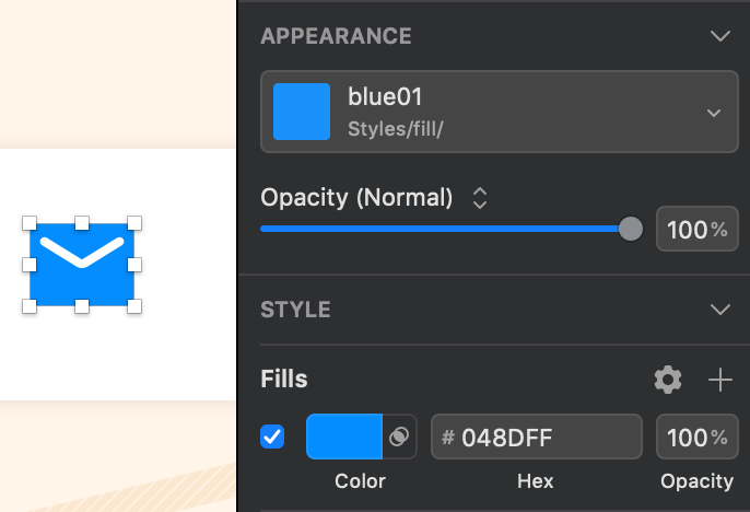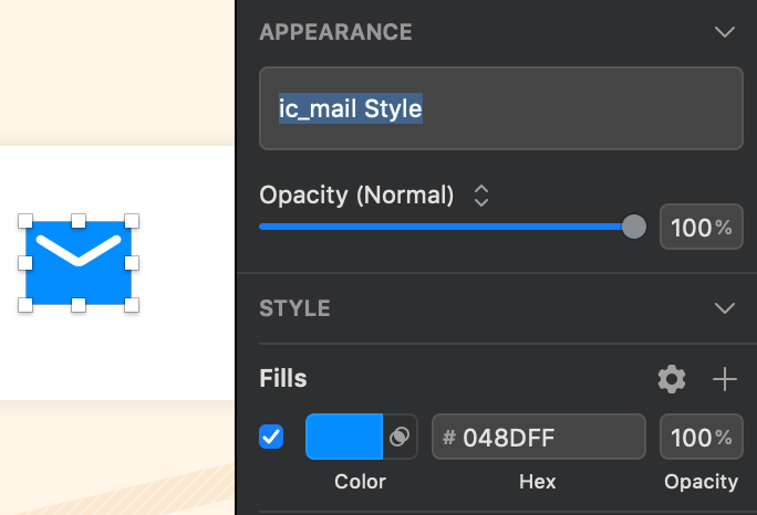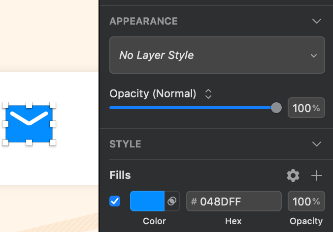 上の画像の左にあるメールアイコン、この青色 #048DFF をレイヤースタイルに登録してみましょう。まずこのアイコンを選択します。Fillsに目当ての色が出てることを確認。